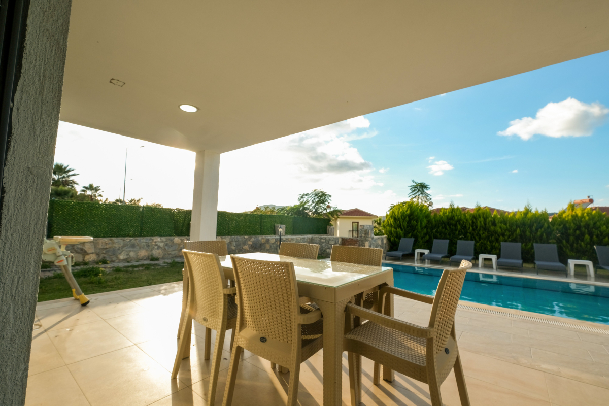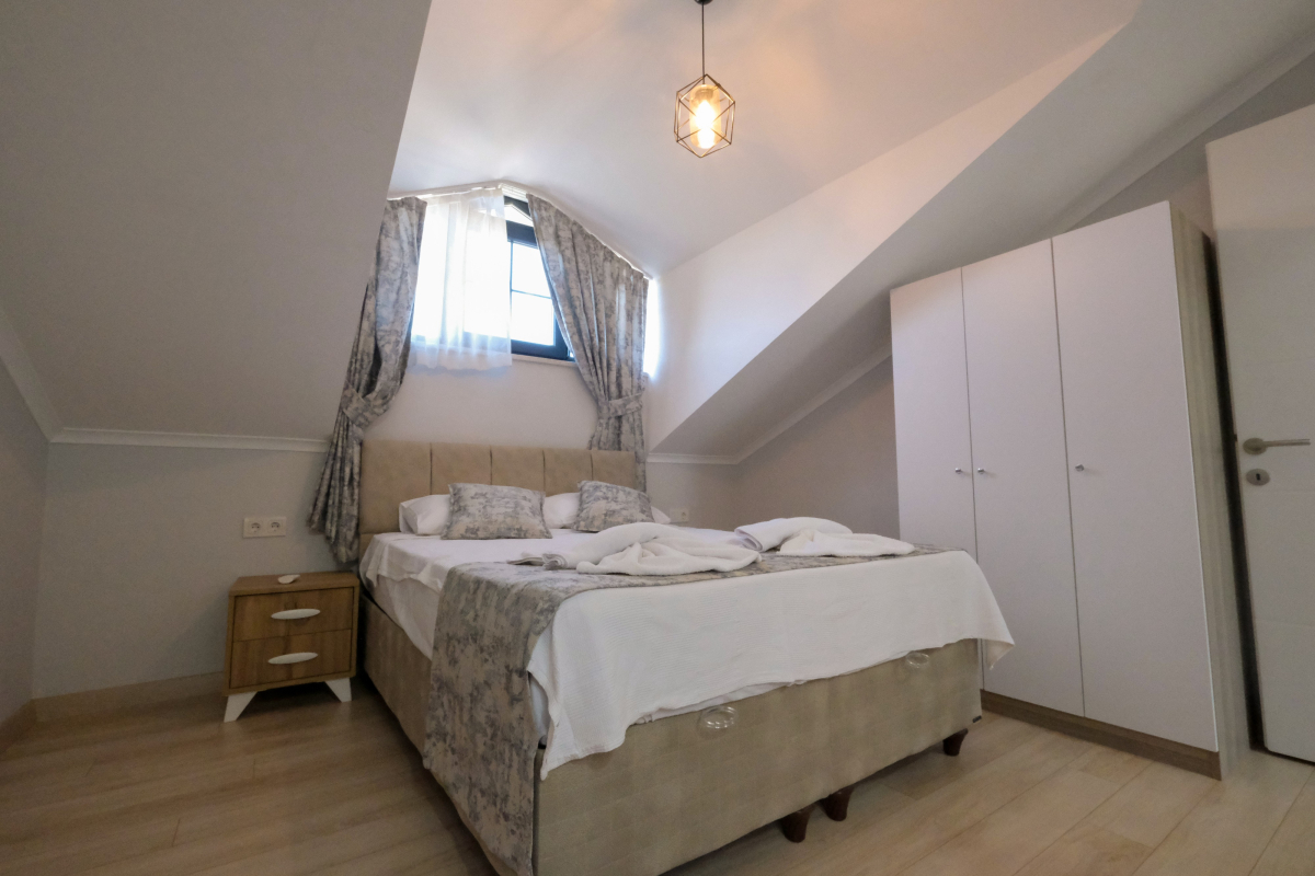 Our villa with a private pool is located in the Ovacik region of Fethiye. Our villa, which has a very large and spacious garden and a green area, is an ideal option for families with children and crowded groups. Our villa, which has a comfortable and comfortable interior design, is located partially close to options such as a market and a restaurant. When Fethiye Ovacik - Oludeniz is mentioned, the first thing that will come to mind will be the magnificent natural bays. Especially those who come on summer holidays should definitely enjoy the sea in these bays. The clarity of the sea and the fact that its green areas can still be protected as before bring the natural values of Hisaronu to the forefront. There are 4 bedrooms and 4 WC-Showers in our villa. 1. there are 2 single beds, air conditioning and WC-Shower in the bedroom. 2. there are 2 single beds, air conditioning and WC-Shower in the bedroom. 3. the bedroom has a double bed, WC-Shower and air conditioning. 4. the bedroom has a double bed, WC-Shower and air conditioning. In the common area there is a sleeping place, air conditioning, TV, WC, living room and kitchen.
