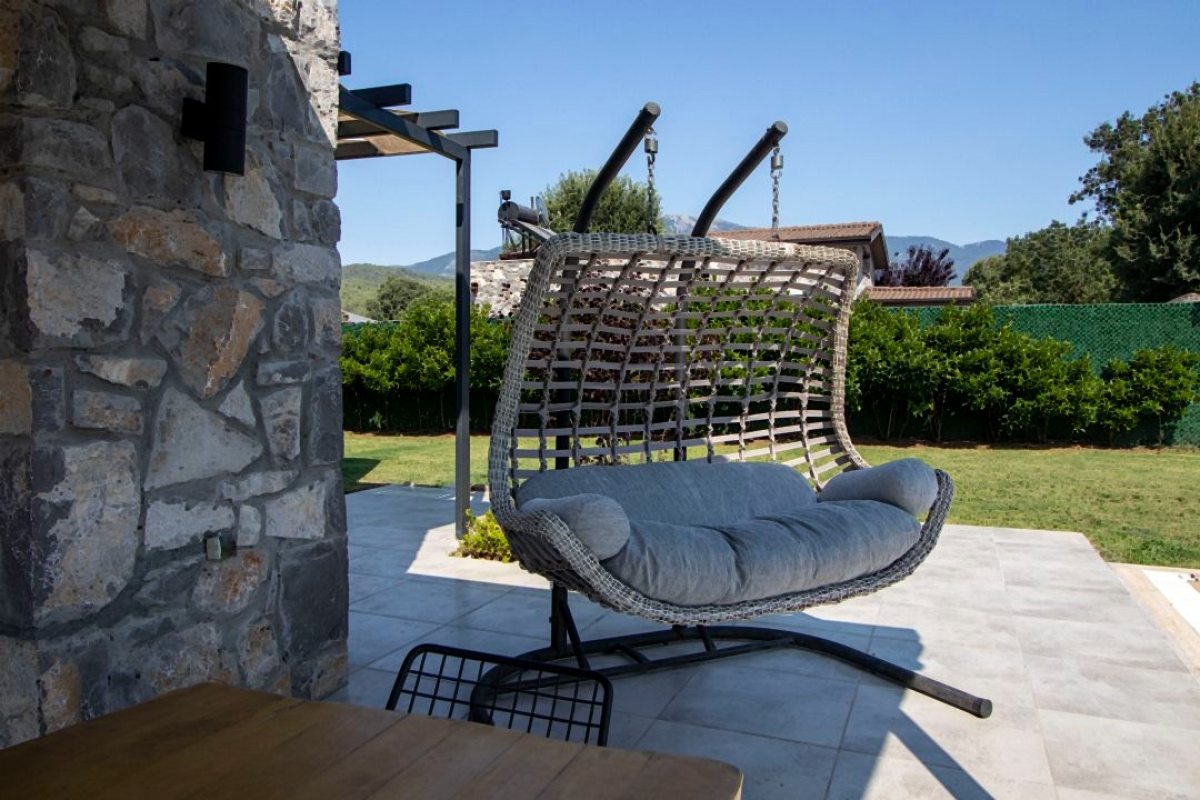 Villanın çevresindeki geniş bahçe, yerel bitki örtüsüyle çevrilidir ve size doğanın tadını çıkarabileceğiniz bir alan sunar. Bahçede özel olarak tasarlanmış bir yüzme havuzu bulunur; serin sularında yüzerek veya güneşlenerek vakit geçirebilirsiniz. Ayrıca bahçede bulunan barbekü alanı ve açık yemek masasıyla sevdiklerinizle keyifli akşam yemekleri düzenleyebilirsiniz.