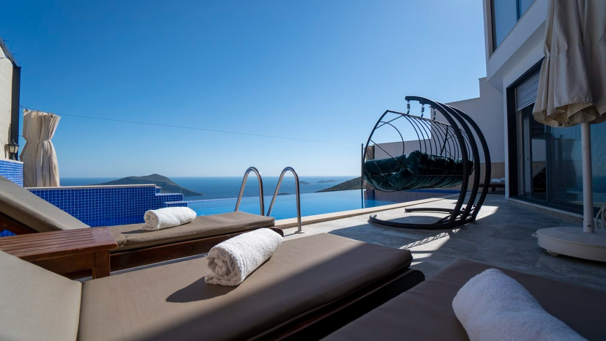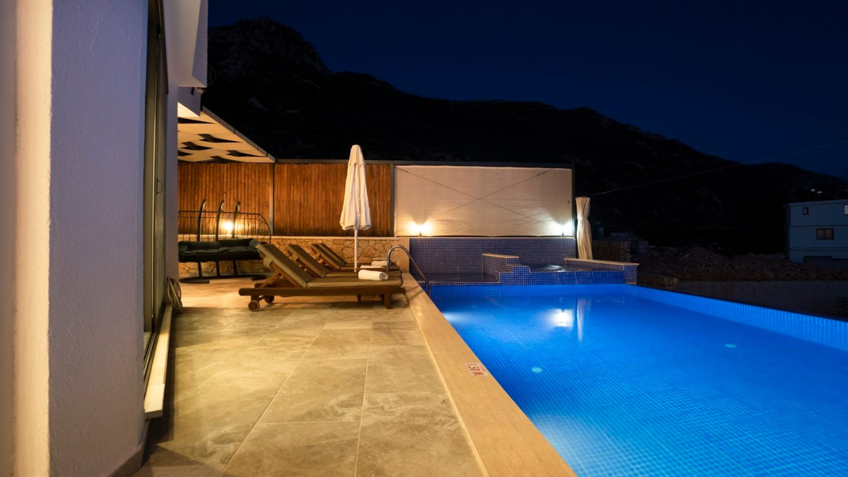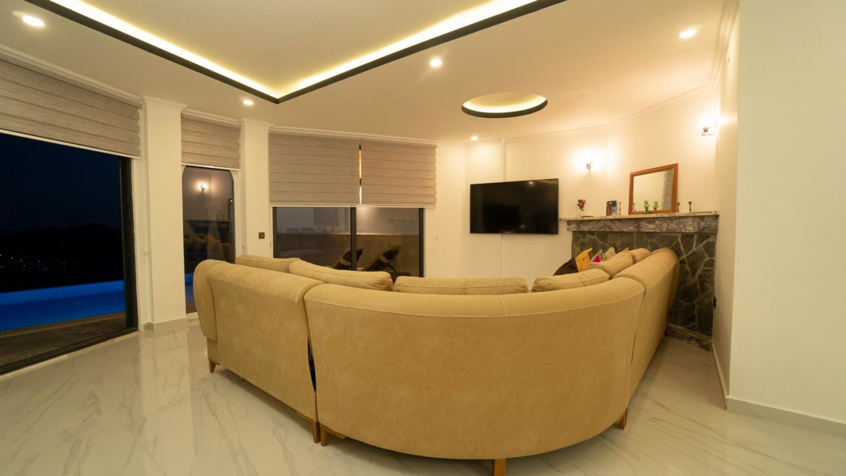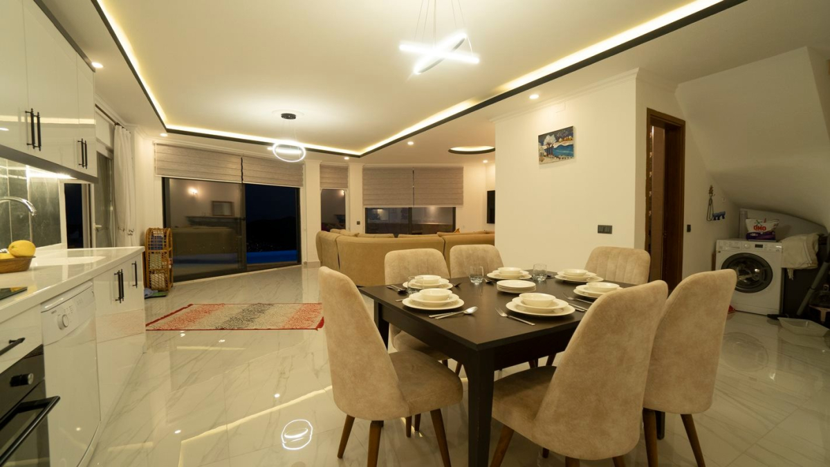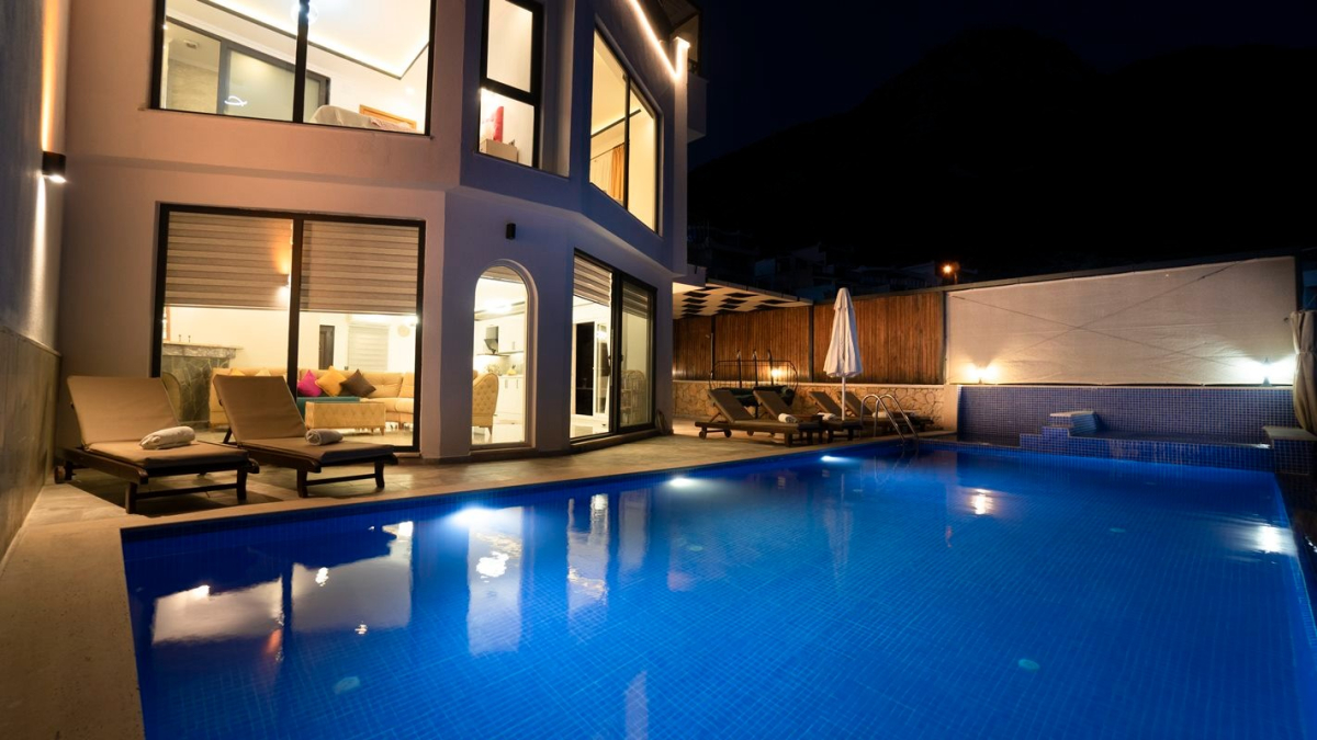 Villa Kübra, located in Kalkan Akbel, has a sea view as well as a nature view. there are 4 bedrooms and each room has a private bathroom, this elegantly designed villa has a private swimming pool but has been kept in a sheltered way. The pool, which is zero to the view, will offer you the opportunity to take your vacation in luxury. Our villa is ideal for crowded families and groups of friends. A great option for your pool parties, this villa also has a separate children's pool for families with children. It is specially designed for our little customers to be comfortable and enjoy the pool. At the same time, there is a jacuzzi in the pool where you can enjoy against the unique Kalkan bay. A wonderful holiday is waiting for you with the view and our specially designed villa. bedroom 1. Bedroom : Double bed, air conditioning, bedside table, wardrobe, vanity table, bathroom and toilet are available. 2. Bedroom : Double bed, air conditioning, bedside table, wardrobe, vanity table, bathroom and toilet are available. 3. and 4. Bedrooms: It also consists of two single beds, again there is a wardrobe, a bedside table, air conditioning in each of our rooms, a vanity table and a shared bathroom and toilet. At the same time, an exit to the balcony can be made from these rooms. Kitchen : Our kitchen is a stylish modern American kitchen and everything you need is available in it. These include a built-in oven, refrigerator, dishwasher, washing machine, kettle for hot drinks, oven, 4 January hob, pots and pans, dining set for about 10 people, cutlery, coffee, water cups. Our kitchen is located on the pool floor and it is very convenient to switch to the pool side. Lounge: Our lounge set has a particularly stylish design and has been designed for you to relax and have fun conversations and relax after dinner. Air conditioning, seating group, LCD TV in our living room., there is a satellite receiver, a dining table and chairs. Our living room is again on the pool floor and exit to the pool side can be made.