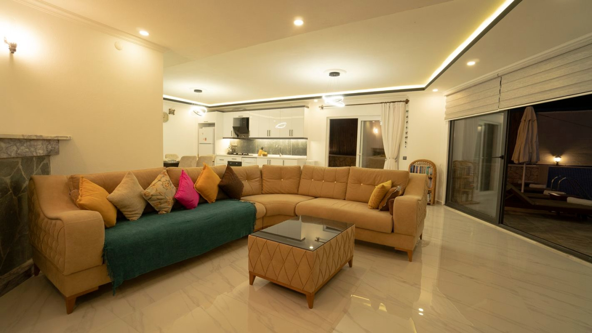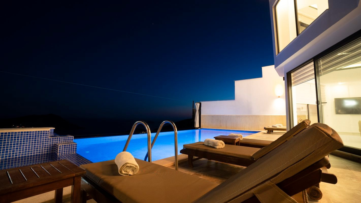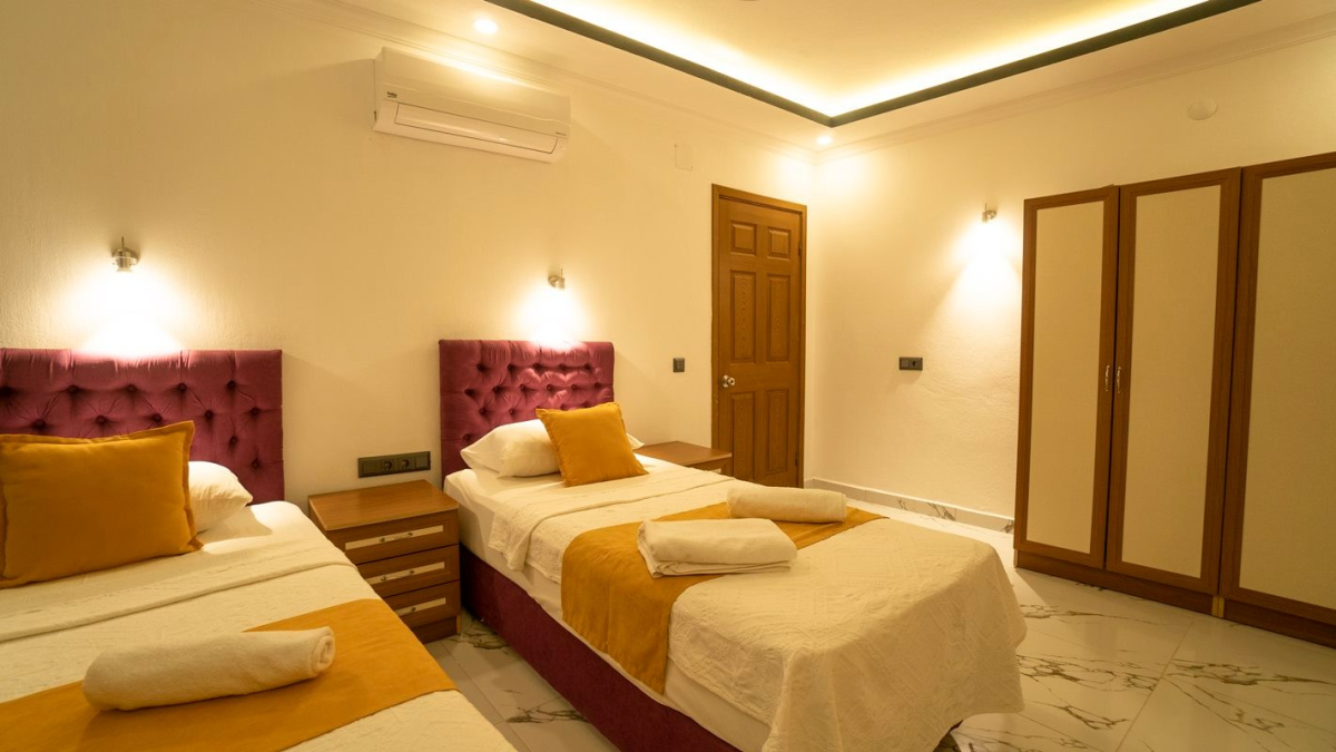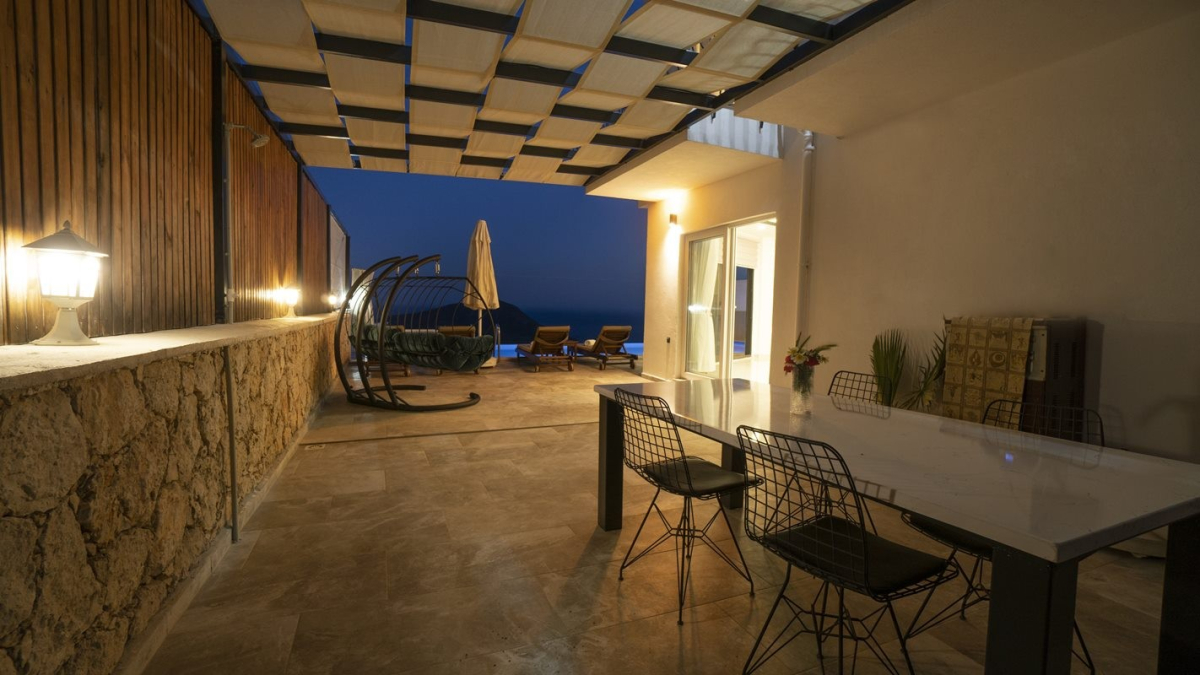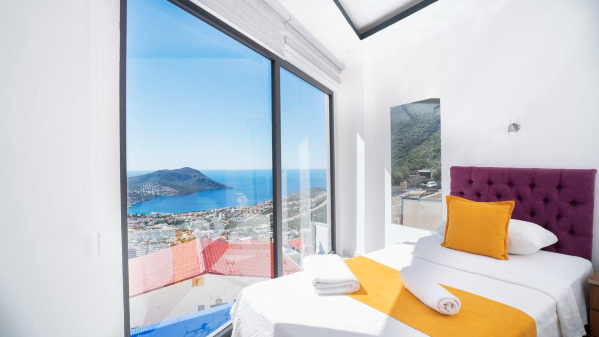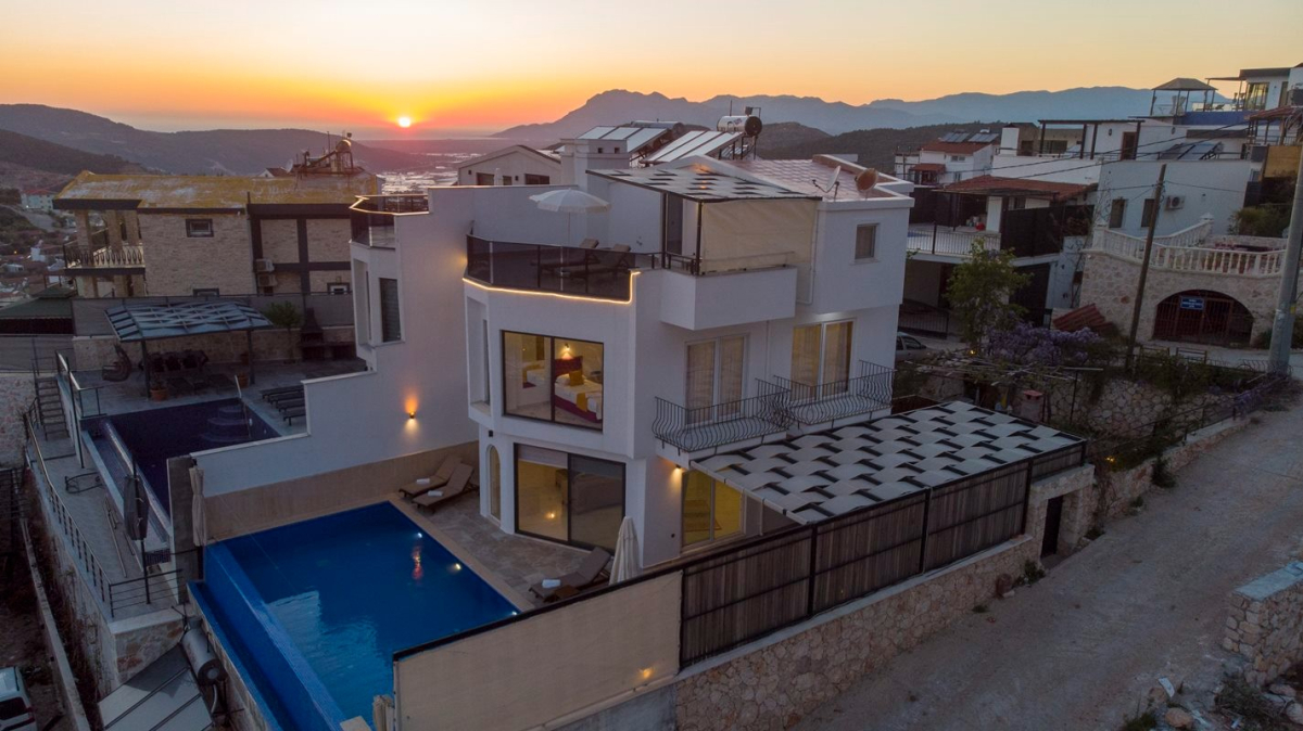Villa Kübra, located in Kalkan Akbel, has a sea view as well as a nature view. there are 4 bedrooms and each room has a private bathroom, this elegantly designed villa has a private swimming pool but has been kept in a sheltered way. The pool, which is zero to the view, will offer you the opportunity to take your vacation in luxury. Our villa is ideal for crowded families and groups of friends. A great option for your pool parties, this villa also has a separate children's pool for families with children. It is specially designed for our little customers to be comfortable and enjoy the pool. At the same time, there is a jacuzzi in the pool where you can enjoy against the unique Kalkan bay. A wonderful holiday is waiting for you with the view and our specially designed villa. bedroom 1. Bedroom : Double bed, air conditioning, bedside table, wardrobe, vanity table, bathroom and toilet are available. 2. Bedroom : Double bed, air conditioning, bedside table, wardrobe, vanity table, bathroom and toilet are available. 3. and 4. Bedrooms: It also consists of two single beds, again there is a wardrobe, a bedside table, air conditioning in each of our rooms, a vanity table and a shared bathroom and toilet. At the same time, an exit to the balcony can be made from these rooms. Kitchen : Our kitchen is a stylish modern American kitchen and everything you need is available in it. These include a built-in oven, refrigerator, dishwasher, washing machine, kettle for hot drinks, oven, 4 January hob, pots and pans, dining set for about 10 people, cutlery, coffee, water cups. Our kitchen is located on the pool floor and it is very convenient to switch to the pool side. Lounge: Our lounge set has a particularly stylish design and has been designed for you to relax and have fun conversations and relax after dinner. Air conditioning, seating group, LCD TV in our living room., there is a satellite receiver, a dining table and chairs. Our living room is again on the pool floor and exit to the pool side can be made.