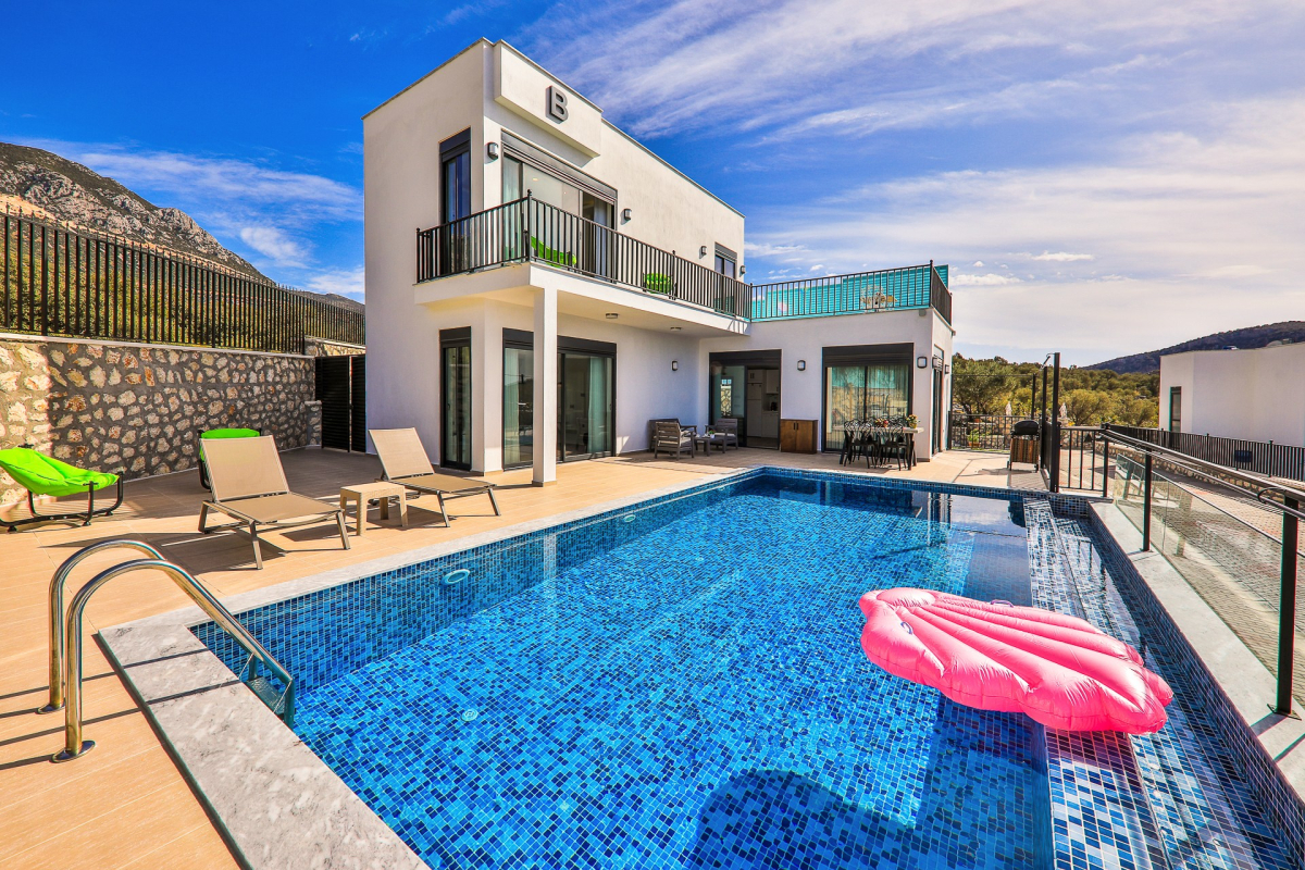 Villa Nazli B, Kalkan Luxury Honeymoon Villa with Magnificent Sea View, Heating Pool , Kalkan Luxury Honeymoon Villa with Magnificent Sea View, Heating Pool Villa Nazlı B, located in Kalkan Barracks area, has a sea view and panoramic Kalkan view, and is a 2-bedroom villa for 4 people. It is one of our villas suitable for honeymoon coupilla Nazli B, Kalkan Luxury Honeymoon Villa with Magnificent Sea View, Heating Pool Villa Nazlı B, located in Kalkan Barracks area, has a sea view and panoramic Kalkan view, and is a 2-bedroom villa for 4 people. It is one of our villas suitable for honeymoon couples, families and friend groups. It has a private heated pool and a large pool terrace. Due to its location, it is very close to the center of Kalkan, but there is a generator and a water tank for electricity, water outages that may occur in our villa. bedroom Bedroom 1: The room with sea view has a double bed, air conditioning, wardrobe, vanity table, bedside table, TV and ensuite bathroom. 1: The room with sea view has a double bed, air conditioning, wardrobe, vanity table, bedside table, TV and ensuite bathroom. Bedroom 2: The sea vieBedroom 1: The room with sea view has a double bed, air conditioning, wardrobe, vanity table, bedside table, TV and ensuite bathroom. Bedroom 2: The sea view room has 2 single beds, a wardrobe, a refrigerator, a TV, a vanity table, a bedside table, air conditioning, a bathroom. Living room There is a seating group, LCD TV, satellite receiver, dining table, shoeshine, air conditioning, coffee table and exit by the pool in the sea view lounge. Kitchen There is a refrigerator, washing machine, dishwasher, built-in January, oven, electric kettle, toaster, toaster, dinnerware, kitchen tools and utensils. Pool and GardenThere is a refrigerator, washing machine, dishwasher, built-in January, oven, electric kettle, toaster, toaster, dinnerware, kitchen tools here is a refrigerator, washing machine, dishwasher, built-in January, oven, electric kettle, toaster, toaster, dinnerware, kitchen tools and uten