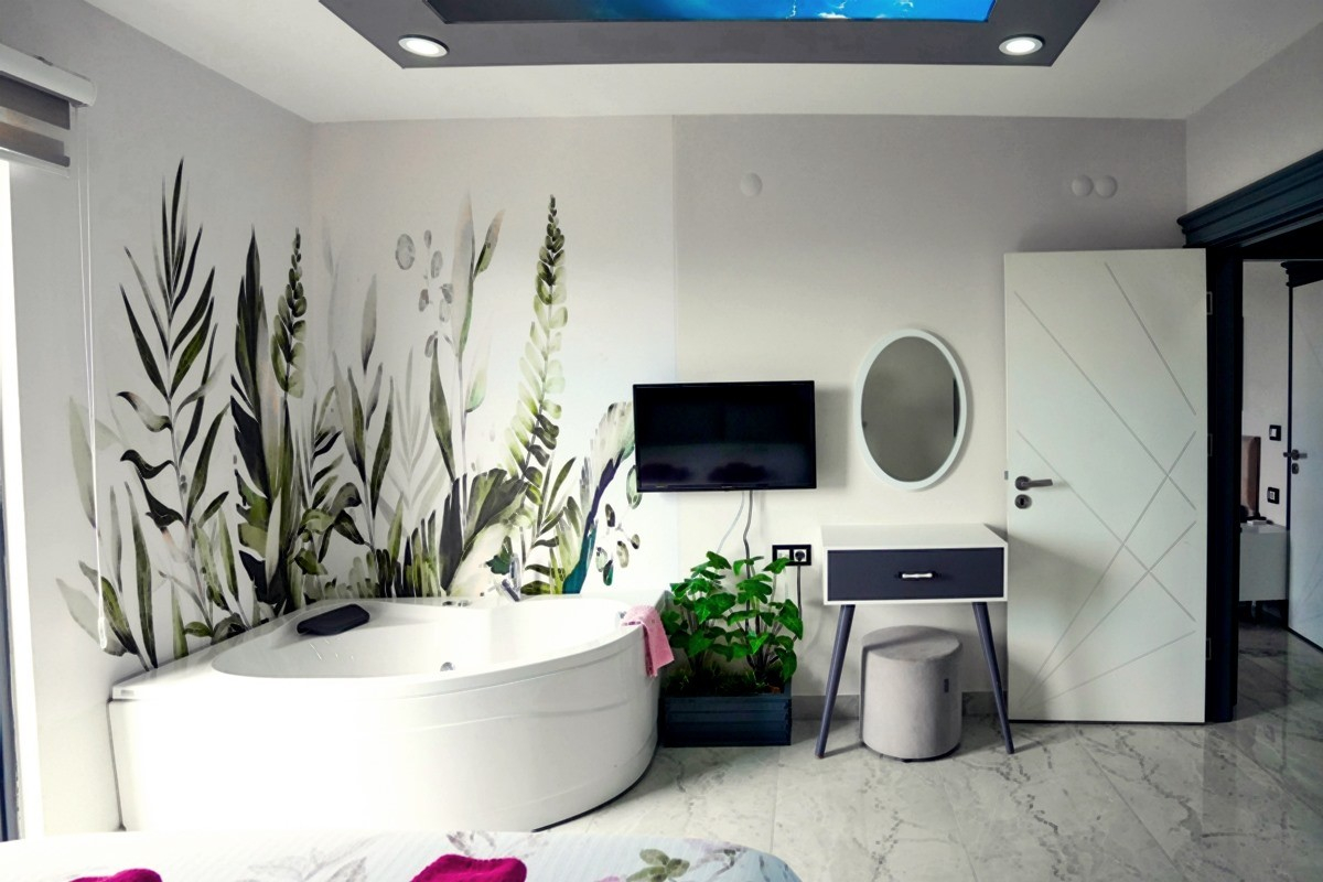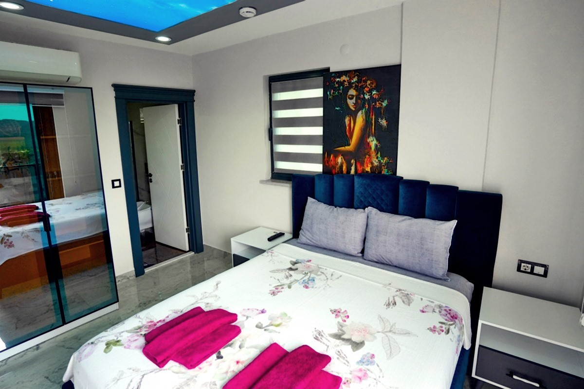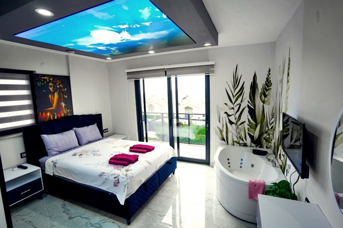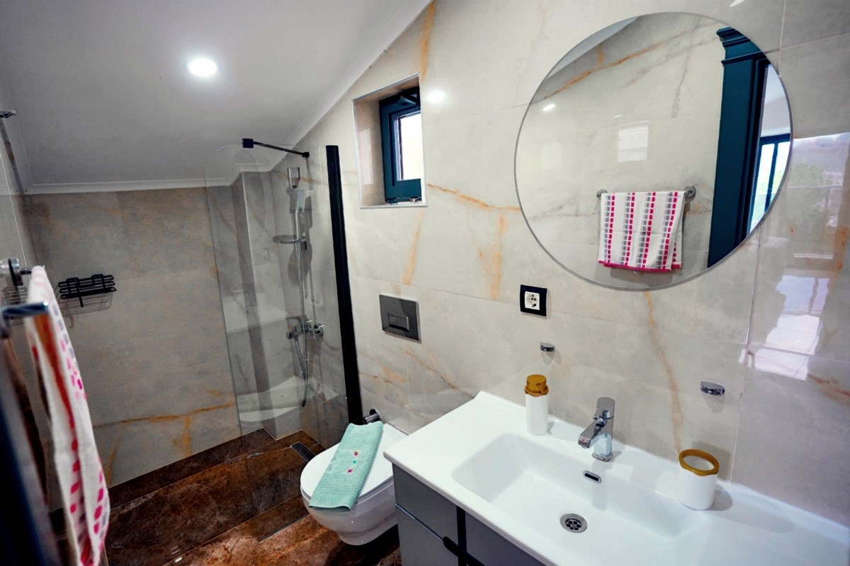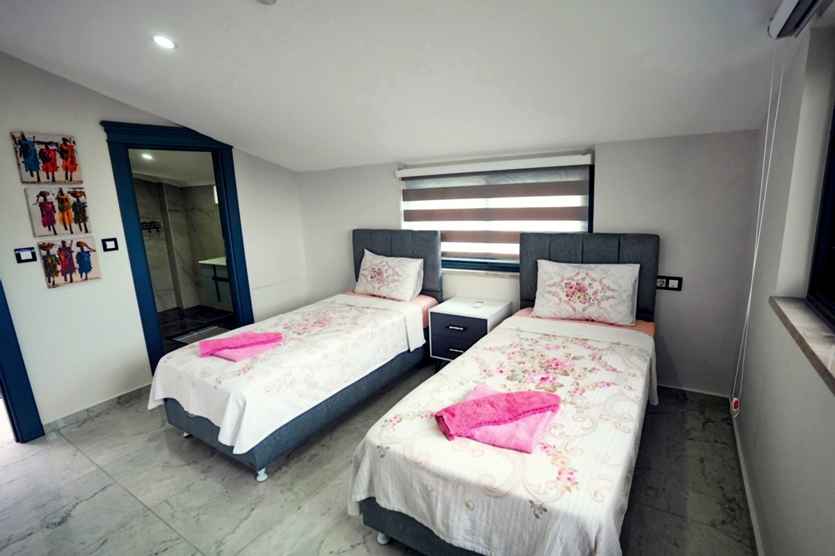 Toplamda 4 yatak odası bulunan villamızın 4 adet banyosu ve 2 adet ayrıca WC mevcuttur. Tüm yatak odalarında bulunan ebeveyn banyosu sayesinde misafirlerimiz rahatlıkla konaklayabileceklerdir. Villamızda zemin katında katında Türk hamamı, sauna, ısıtmalı iç havuz ve WC yer almaktadır. 1.katta ise açık mutfak-salon, TV, klima ve WC yer alırken, 2. katta birinci ve ikinci yatak odası yer alır. Birinci ve ikinci yatak odalarında birer adet çift kişilik yatak, klima, TV, WC-Duş ve jakuzi bulunmaktadır. Çatı katında yer alan üçüncü ve dördüncü yatak odalarında ise ikişer adet tek kişilik yatak, klima, TV ve WC-Duş yer almaktadır.