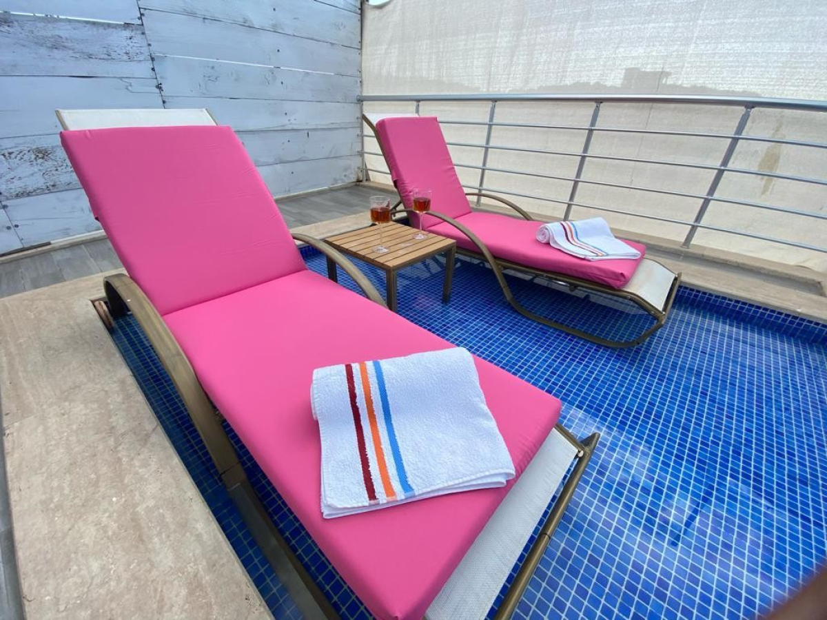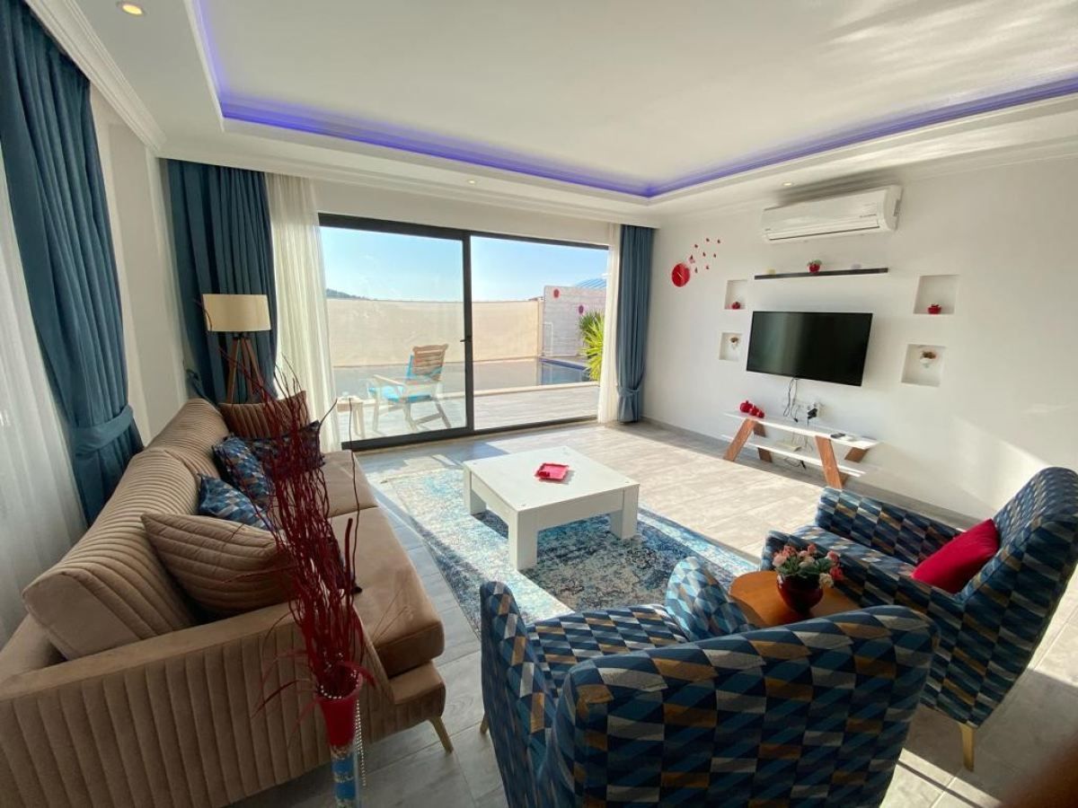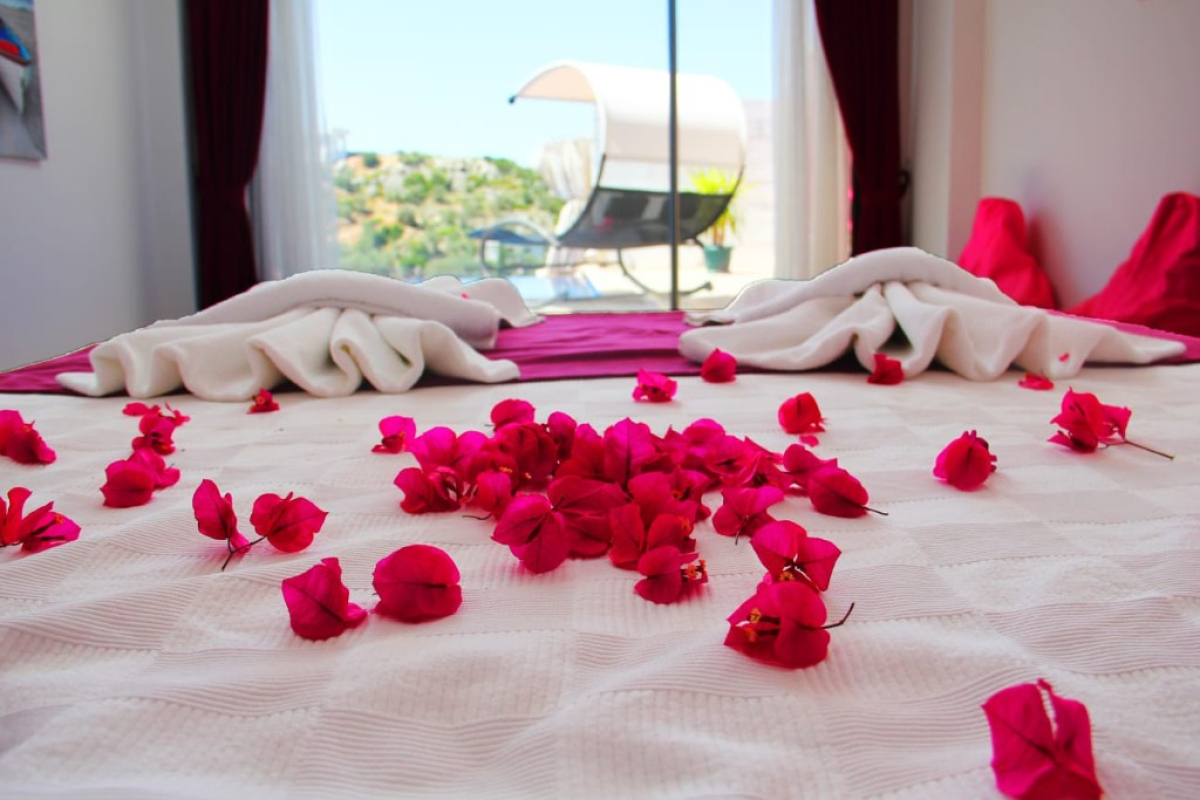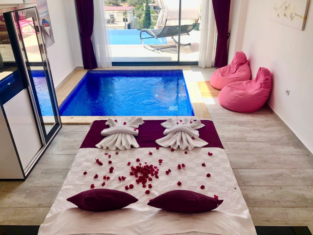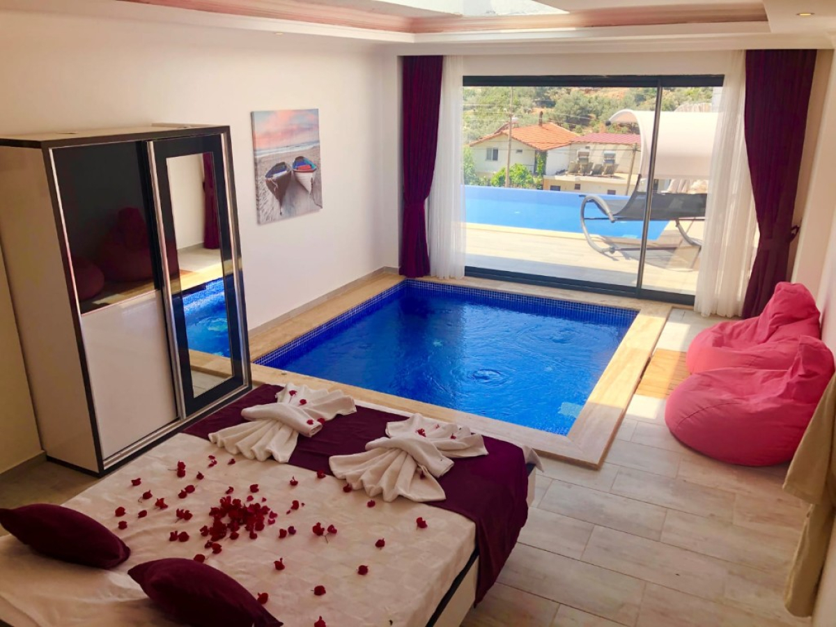 Located in Antalya's Kas district, Kalkan resort, Kördere region, Villa Burcum has a capacity of 2 people and has been specially designed for honeymoon couples. There is a private pool bed for couples on the pool terrace and a cozy seating group opposite. You can make your holiday in any season with the indoor heated pool, which is suitable for use throughout the year.