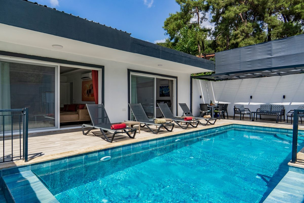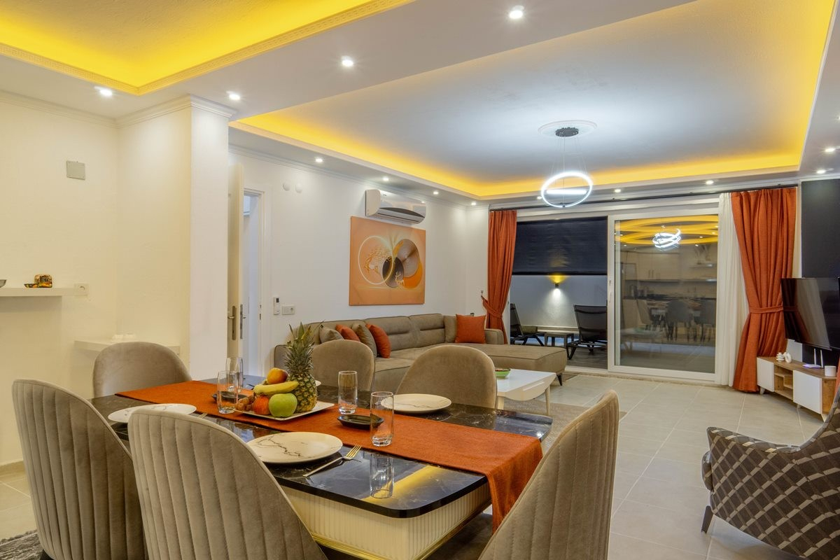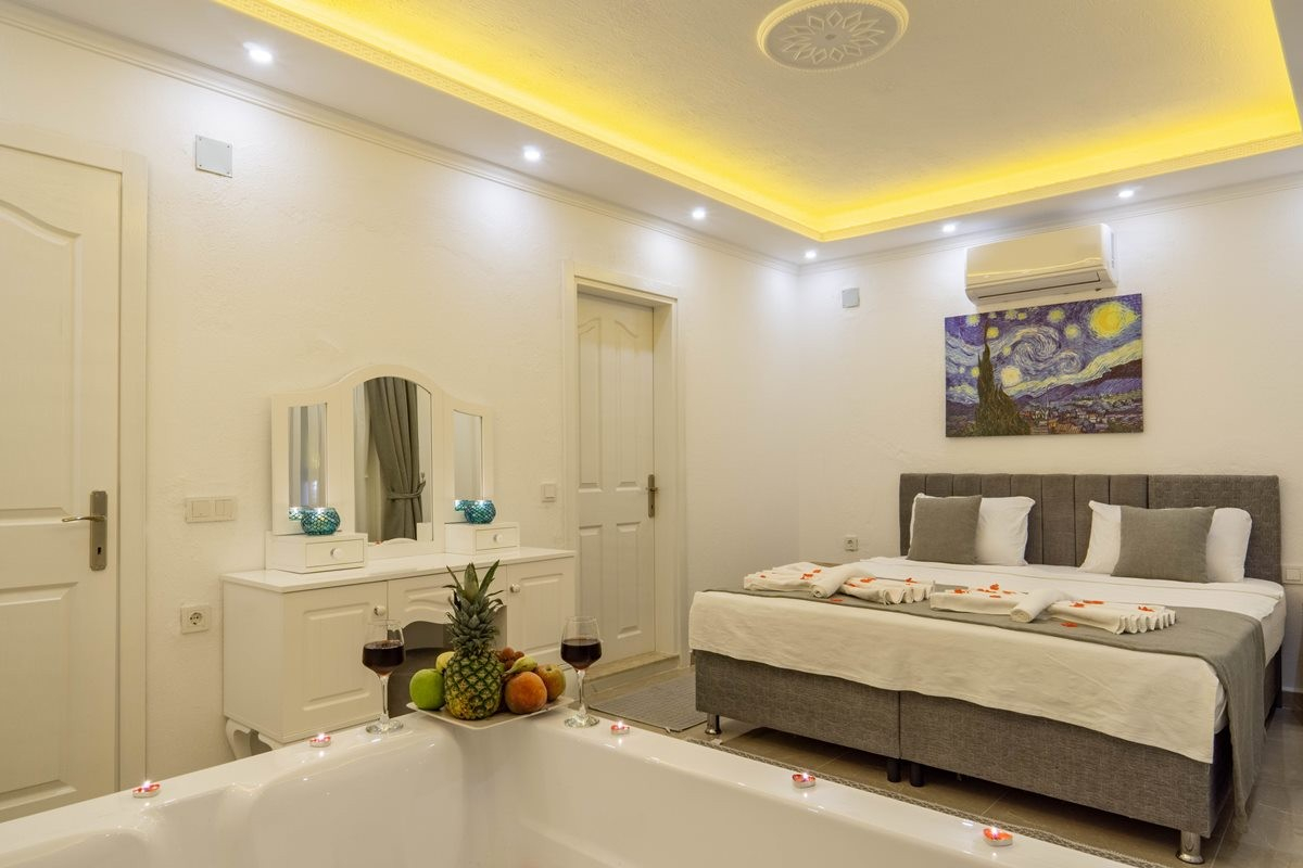 Villa Caliza is a rented villa located in the village of Islamlar in Kalkan, with a view of nature Decked out among greenery. Our modern and comfortably designed summer villa has 2 bedrooms and provides accommodation for 4 people. There is a jacuzzi in the bedroom where you can relieve all your fatigue. The pool and pool terrace of our summer villa, which caters to honeymoon couples and nuclear families, have been made sheltered. Our rented villa is not visible from the outside. Our conservative couples can choose with peace of mind. You can choose Villa Caliza for a peaceful honeymoon holiday in silence and tranquility. NOTE 1: Our landlord lives on the lower floor of our villa. The entrance of the lower floor and the entrance of our villa are completely different and independent. * Since our villa is located in nature, there may be insects, flies, pests around it, and this is a normal situation. * In our region, which has a mountainous area in terms of geographical structure, all our villas in and around Kalkan are built on the hillside. For this reason, it is uphill on the way to our villas. * We always guarantee 95% invisibility in our fully protected villas. The remaining 5% is your avoidance share due to the non-appearance of the end and corner points.
