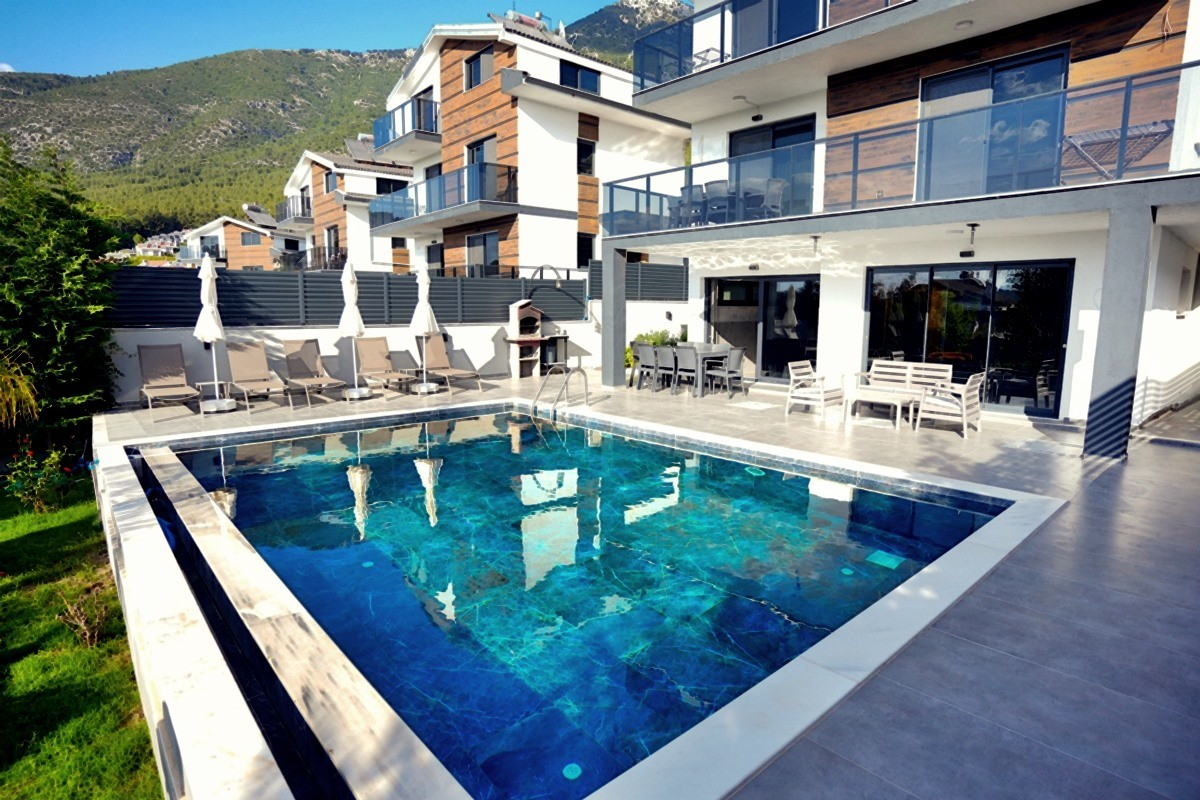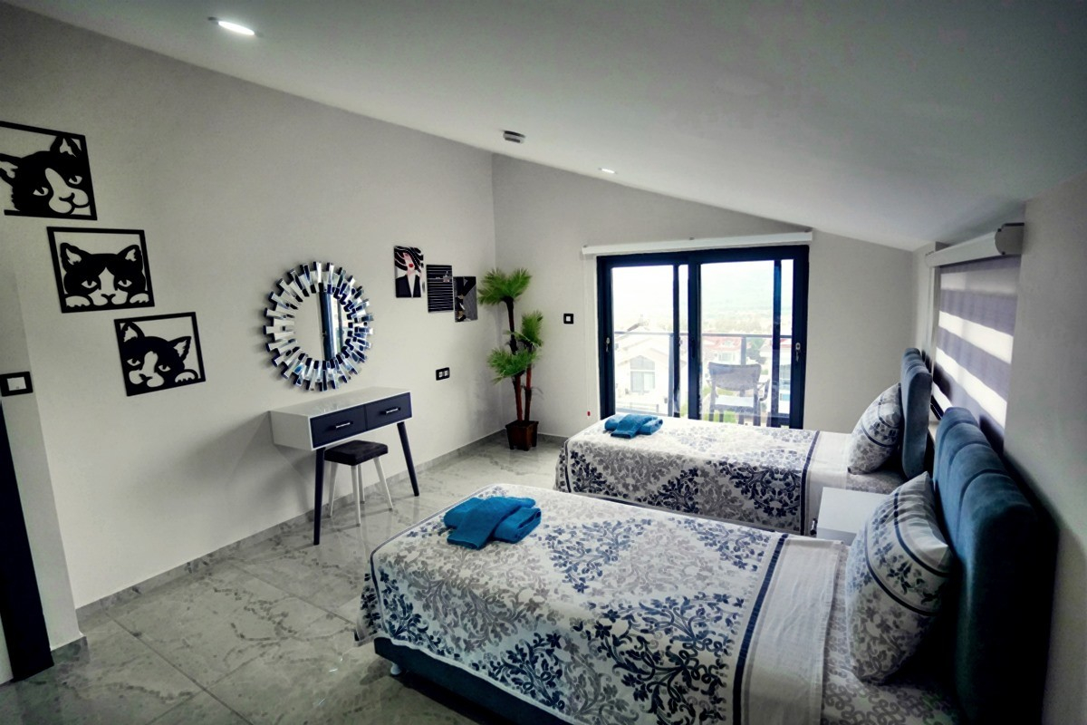 Villa Dedem 3 is our villa with a private pool located in Fethiye Ovacik-Oludeniz region. Our villa, which has modern interior and exterior architecture, has entertainment centers and a market where you will meet your needs, etc. it is located close to such options. Villa Dedem 3, which is a nice option for crowded groups and families with children, will allow you to have a pleasant time. When Fethiye Ovacik - Oludeniz is mentioned, the first thing that will come to mind will be the magnificent natural bays. Especially those who come on summer holidays should definitely enjoy the sea in these bays. The clarity of the sea and the fact that its green areas can still be protected as before bring the natural values of Hisaronu to the forefront. Our villa has a total of 4 bedrooms, 4 bathrooms and 2 separate toilets. Thanks to the ensuite bathroom in all bedrooms, our guests will be able to stay comfortably. There is a Turkish bath, sauna, heated indoor pool and toilet on the ground floor of our villa. 1.on the floor there is an open kitchen-living room, TV, air conditioning and WC, while 2. there are first and second bedrooms on the floor. The first and second bedrooms have a double bed, air conditioning, TV, WC-Shower and jacuzzi. The third and fourth bedrooms located on the attic floor have two single beds, air conditioning, TV and WC-Shower. On the side of this house there is Villa Dedem 1, Villa Dedem 2, Villa Dedem 4, Villa Dedem 5, which belong to the same landlord.