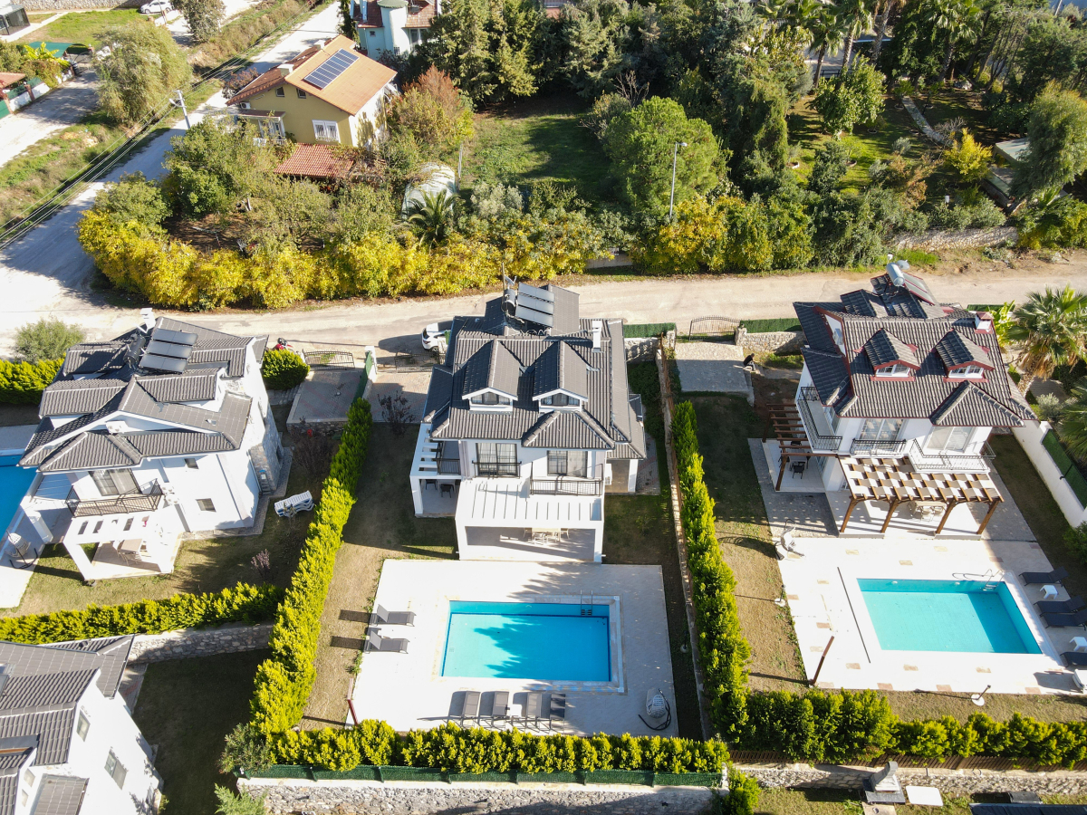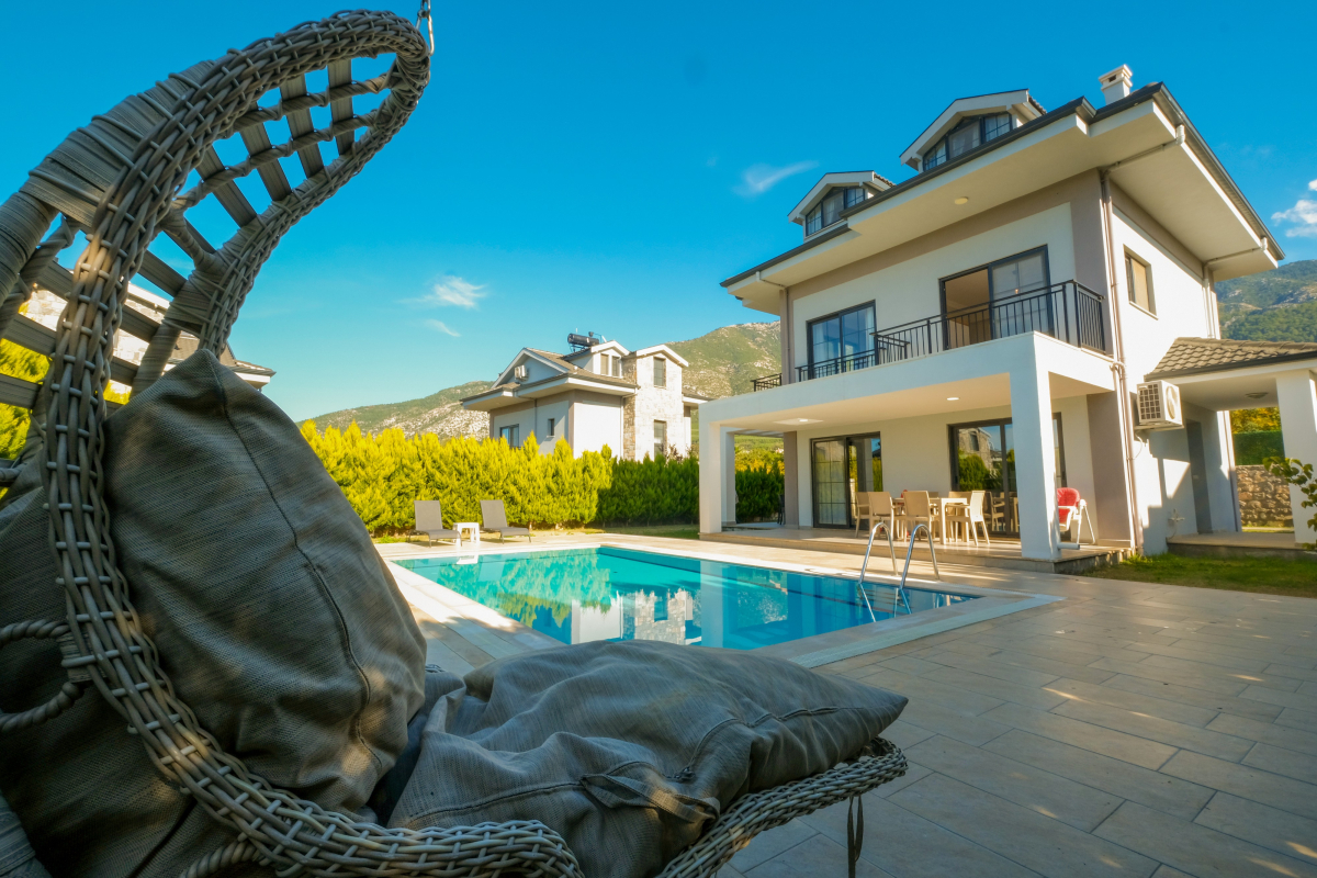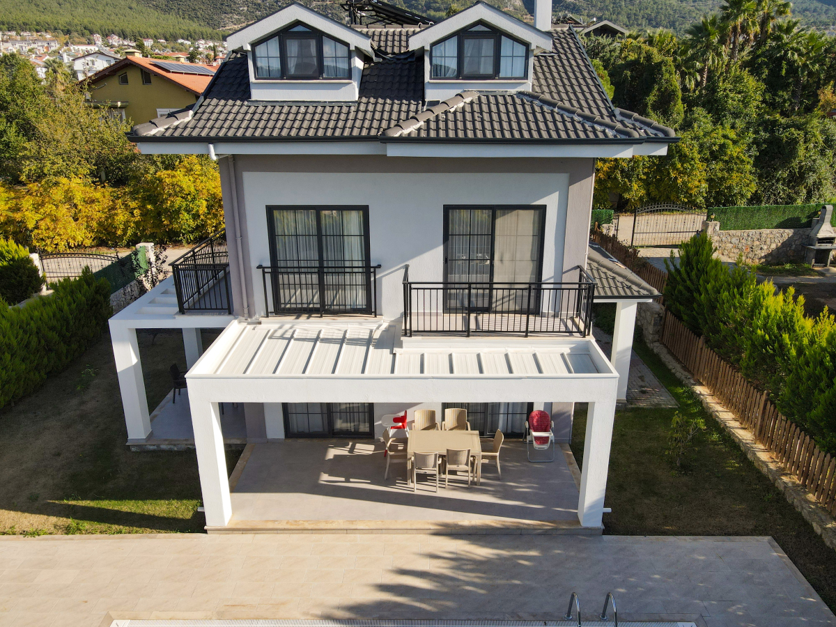 Our villa with a private pool is located in the Ovacik region of Fethiye. Our villa, which has a very large and spacious garden and a green area, is an ideal option for families with children and crowded groups. Our villa, which has a comfortable and comfortable interior design, is located partially close to options such as a market and a restaurant. When Fethiye Ovacik - Oludeniz is mentioned, the first thing that will come to mind will be the magnificent natural bays. Especially those who come on summer holidays should definitely enjoy the sea in these bays. The clarity of the sea and the fact that its green areas can still be protected as before bring the natural values of Hisaronu to the forefront. There are 4 bedrooms and 4 WC-Showers in our villa. 1. there are 2 single beds, air conditioning and WC-Shower in the bedroom. 2. there are 2 single beds, air conditioning and WC-Shower in the bedroom. 3. the bedroom has a double bed, WC-Shower and air conditioning. 4. the bedroom has a double bed, WC-Shower and air conditioning. In the common area there is a sleeping place, air conditioning, TV, WC, living room and kitchen.