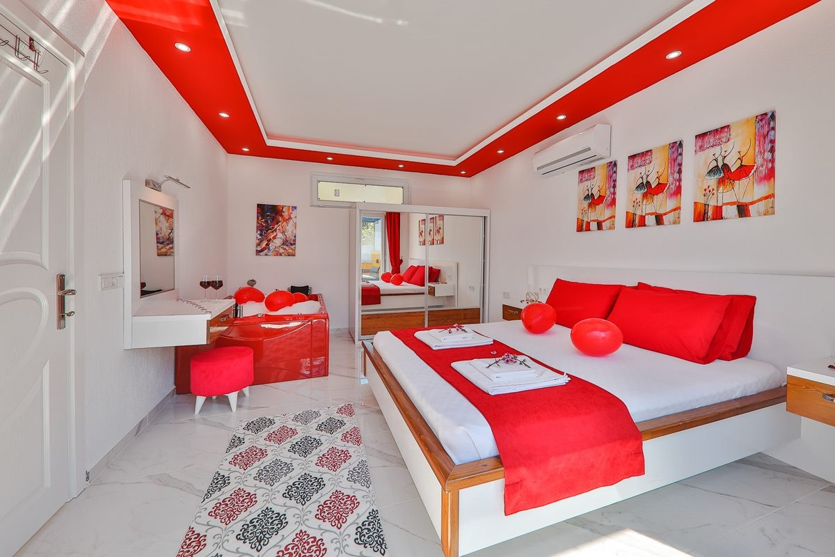 Villa Mustard is our luxury villa with sea view located in Antalya Kas-Kalkan Islamlar-Lapaz, one of the popular holiday resorts. Our villa, which has been carefully designed for our honeymoon couples, has 1 bedroom and has a capacity for 2 people. Everything you may need during your holiday has been thought out and carefully designed. Offering a comfortable holiday to its guests with a private swimming pool, our villa has an exquisite sea view with Kalkan and the Islands. Capacity Our villa has 1 bedroom, can accommodate 2 people and guests over capacity are not accepted. our guests between the ages of 0-3 can make accommodation using a Decked bed and are not included in the capacity. Villa Mustard (for 2 people) and Villa Alfa (for 6 people) are located next to each other. According to the availability of the calendar, a total accommodation capacity of 8 people can be reached with the possibility of renting at the same time. Bedrooms 1.Bedroom : There is a double bed, a bedside table, a wardrobe, air conditioning, a vanity table, an ensuite bathroom and a jacuzzi. Clean bed linen and towels are provided in the bedrooms. Jul.