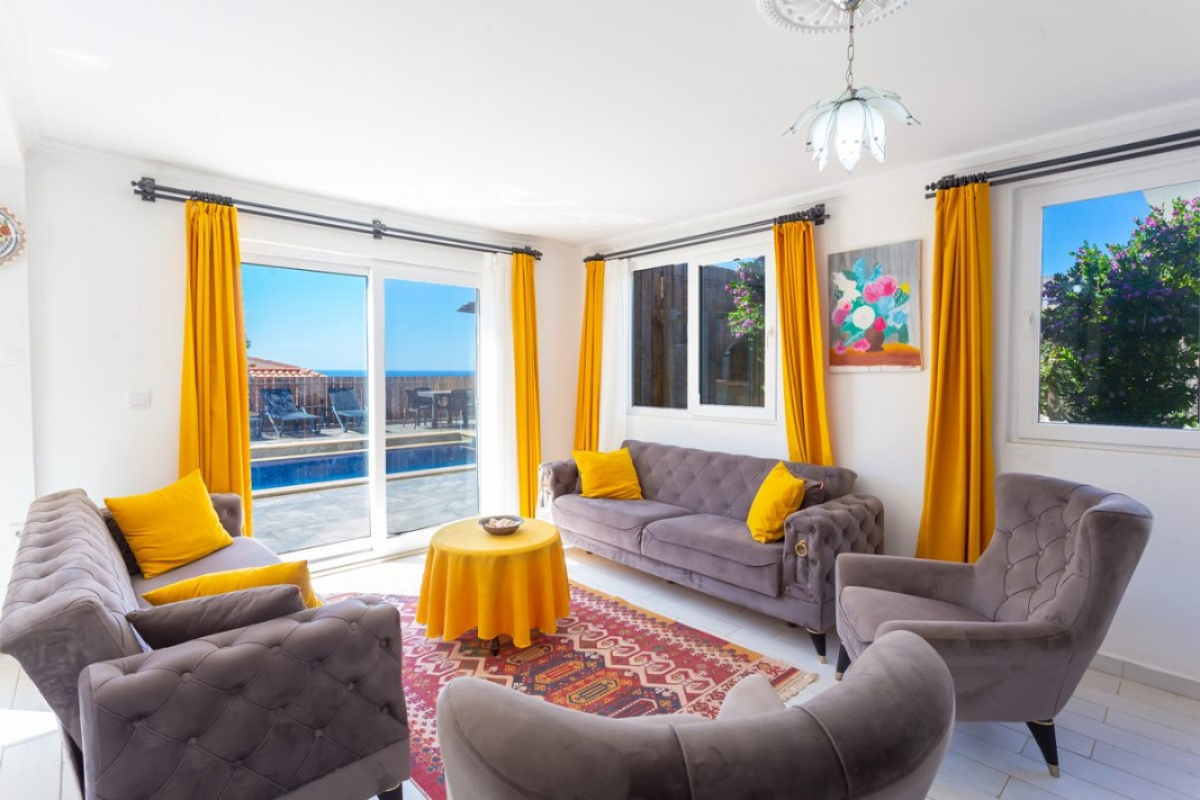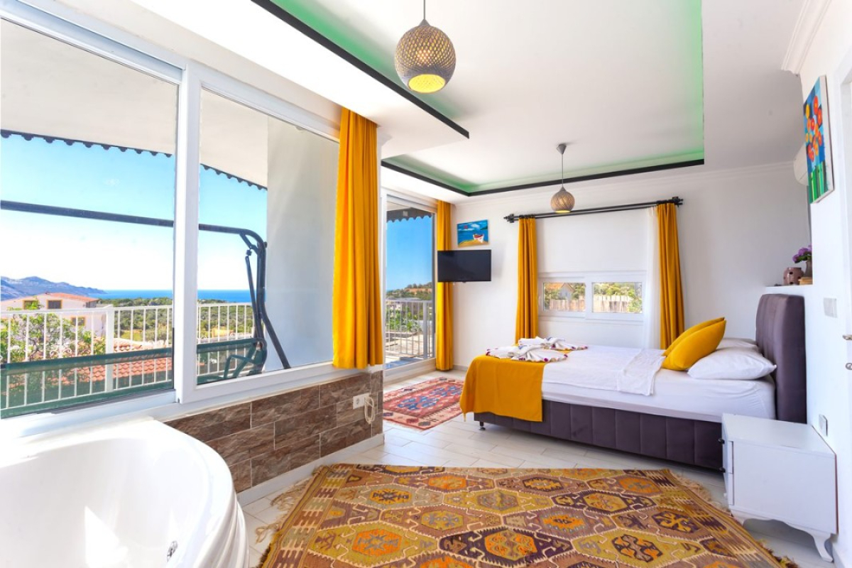 Villa Moren Villa Moren is located in the Gökseki district of Kas, the favorite holiday resort of villa tourism. Our villa has been carefully designed for honeymooners and nuclear families and has a capacity of 2 rooms and 4 people. Our two-storey conservative concept villa with panoramic sea views has a sheltered swimming pool and there is a jacuzzi in the bedroom. Villa Moren has a pool terrace and a private swimming pool and all the details such as a Jacuzzi for guests to have a nice time are available in the villa. The private swimming pool of our villa is isolated from the surroundings and is an ideal villa for conservative families. Garden decoration items, such as villa decoration items, have also been selected with pleasure. Our villa is located 5.5 km from the center of Kas. NOTE: A cleaning fee of TL 2000 is requested for stays under 7 nights. The minimum stay is 3 nights. Note : The last 100 meters of the road to the villa is stabilized. Bedrooms : 1. Bedroom: Sea view suite is a family bedroom with 1 double bed, jacuzzi, bedside table, TV, vanity table, wardrobe, air conditioning, bathroom/toilet and balcony. 2. Bedroom: The suite is a junior bedroom and has 2 single beds, a bedside table, a wardrobe, air conditioning and a SHARED bathroom/toilet. Living room : The living room with nature view has a modern seating group, satellite receiver, LCD TV, modem for internet, air conditioning and access to the pool terrace.