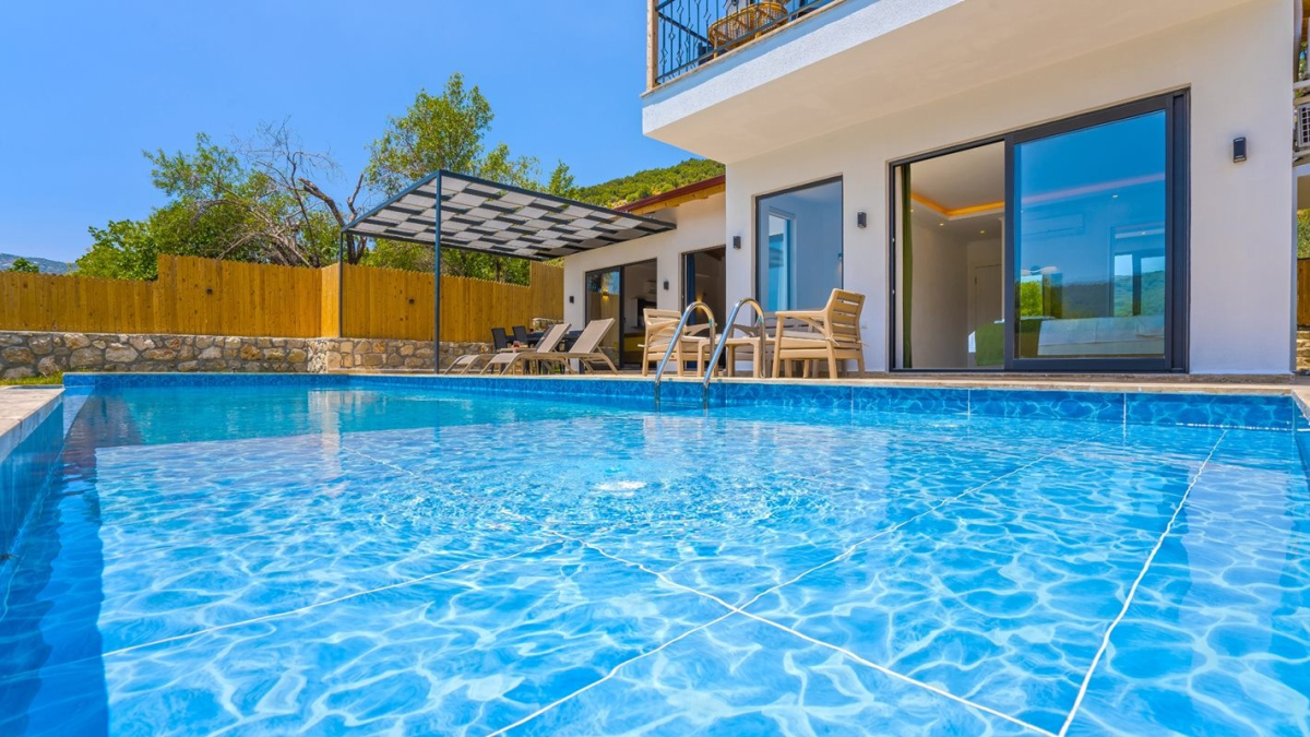 Located in the Saribelen area of Kalkan, our villa has 2 bedrooms and has an accommodation capacity of 4 people. The private pool terrace of our villa is sheltered and offers you the opportunity of a secluded holiday. There is a jacuzzi in the main bedroom of our villa. Our villa is also an ideal option for our honeymoon couples and opens its doors to you. Living room There is a seating group, TV, air conditioning, coffee table in the living room. It is possible to exit to the pool terrace. Kitchen There is a modern American kitchen with a dining table for 6 people, a refrigerator, a dishwasher, an oven, a January, a microwave oven, a toaster, a dining table, dinnerware, cutlery and knife sets, pots and pans, cups. Bedrooms 1. Bedroom: There is 1 double bed, air conditioning, bedside table, wardrobe, vanity table, jacuzzi, bathroom and toilet. 2. Bedroom: There are 2 single beds, air conditioning, bedside table, wardrobe, vanity table, bathroom and toilet. Pool Dimensions Pool Length: 9.5 m Width: 3.5 m Depth: 150 cm. The private swimming pool of our villa is conservative and definitely not visible from the outside. There are sun beds, umbrellas, a dining table, a barbecue. Damage Deposit A cash damage deposit of 3500 TL is taken at the entrance to the villa. Damage to the villa, casualties, fractures, etc. if such situations do not occur, this price will be refunded on the day of departure.