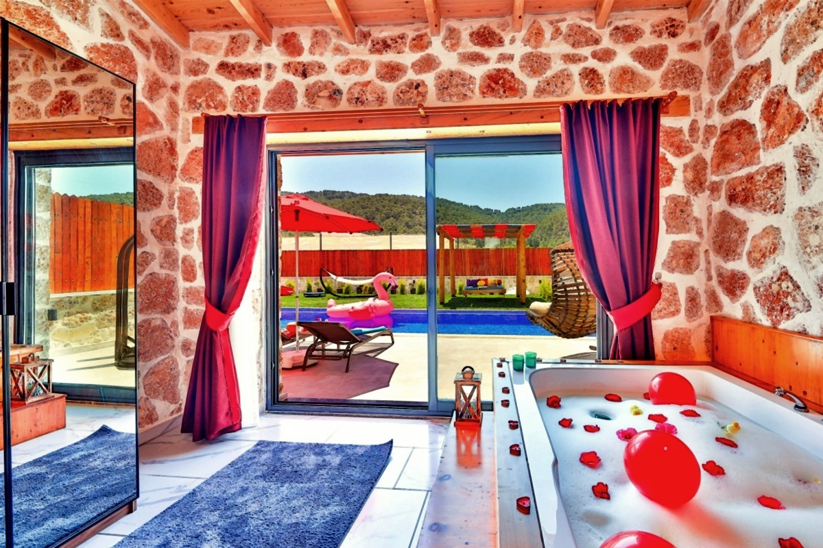 Villa Düşler Bahçesi Kalkan Sarıbelen bölgesinde konumlanmış taş ve ahşap mimariye sahip, modern ve konforlu dizayn edilen 2 yatak odalı 5 kişi konaklama kapasiteli kiralık yazlık tatil villasıdır. Villanız doğa içinde konumlanmış olup siz değerli misafirlerimize gözlerden uzak tatil imkanı sunmaktadır. Geniş bahçesi alanı, oyun parkı gibi çeşitli aktiviteleri ile çocuklu aileler içinde ideal bir seçenek olacaktır ayrıca ana yatak odasında jakuzisi bulunan villamız Kalkan şehir merkezine 15 dk mesafededir.