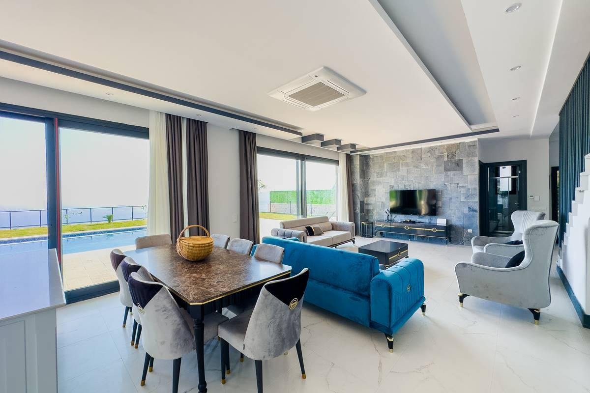 Detayları: Oturma grubu, Uydu TV (LCD), Klima, 8 kişilik yemek masası, Havuz kenarına çıkış ve WC & Lavabo bulunmaktadır.