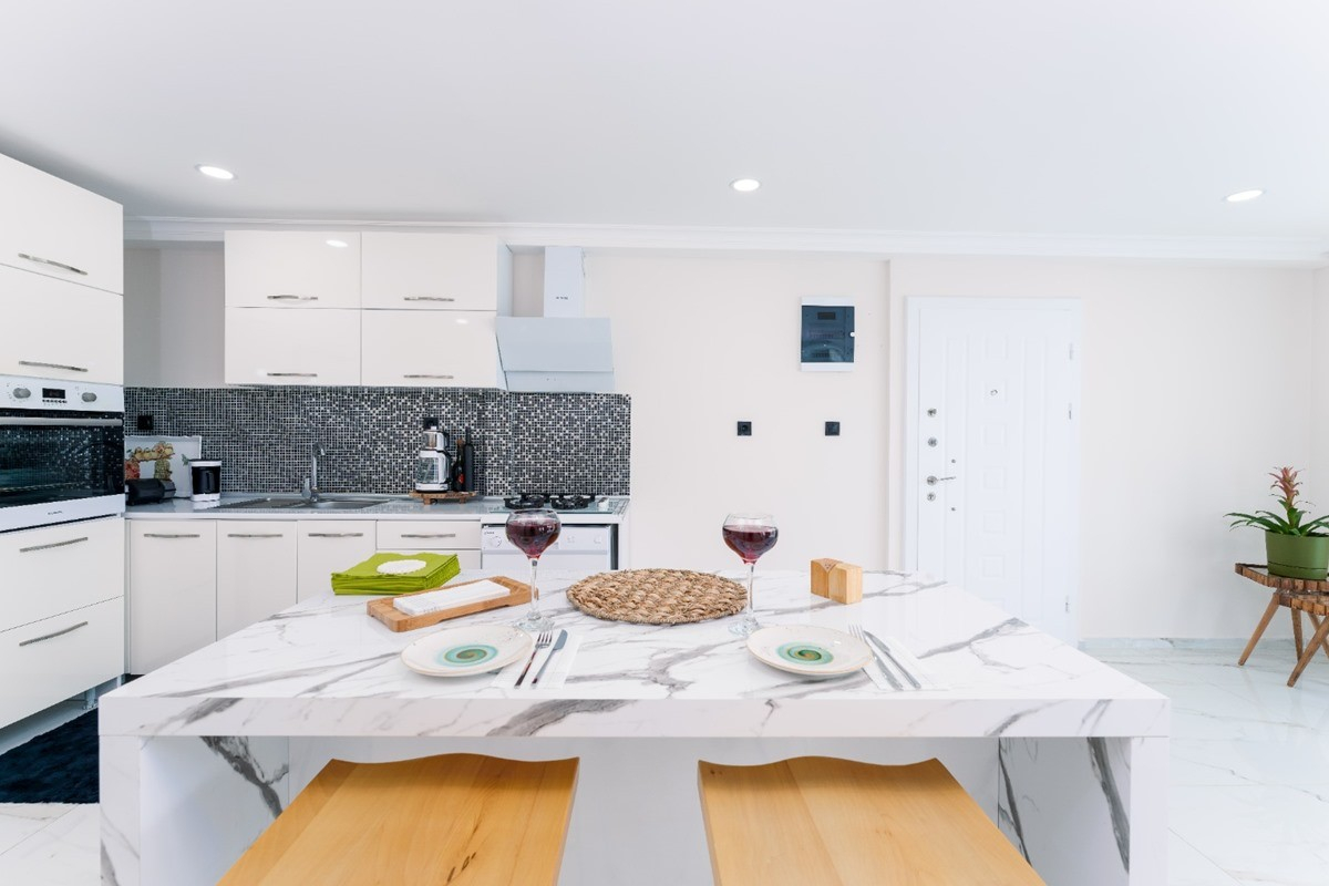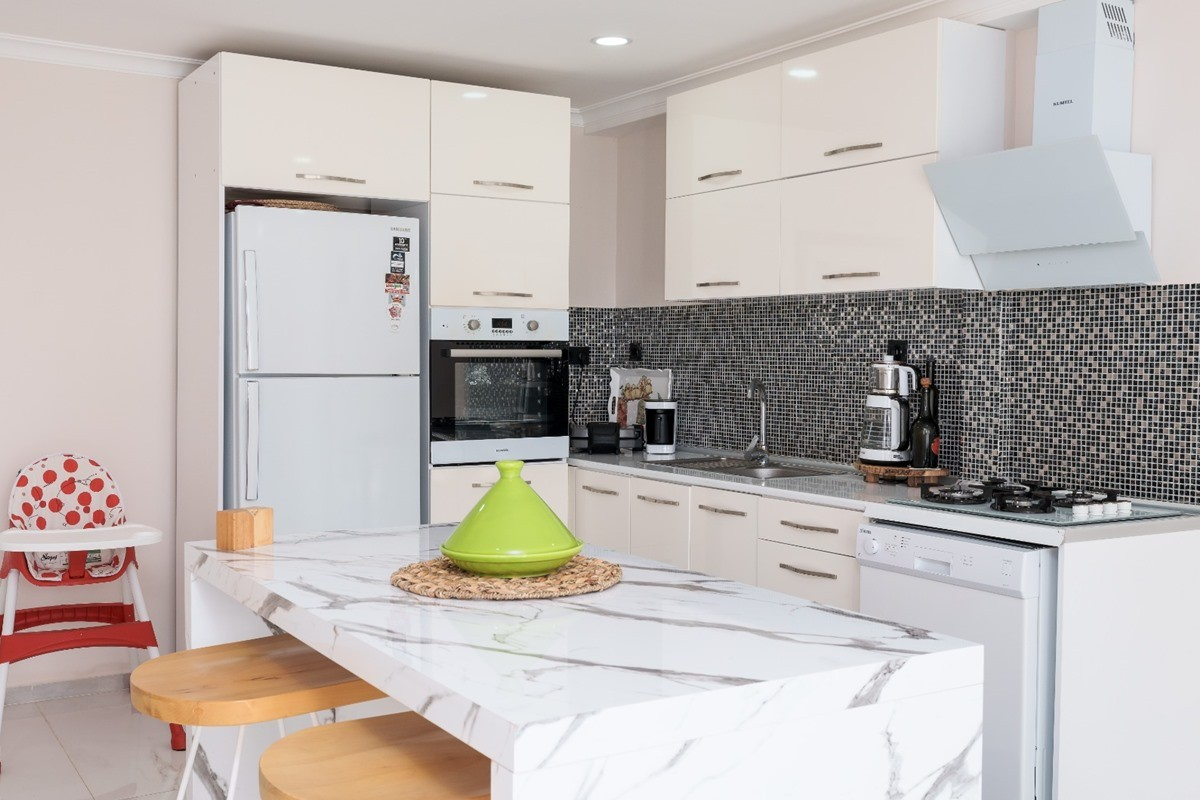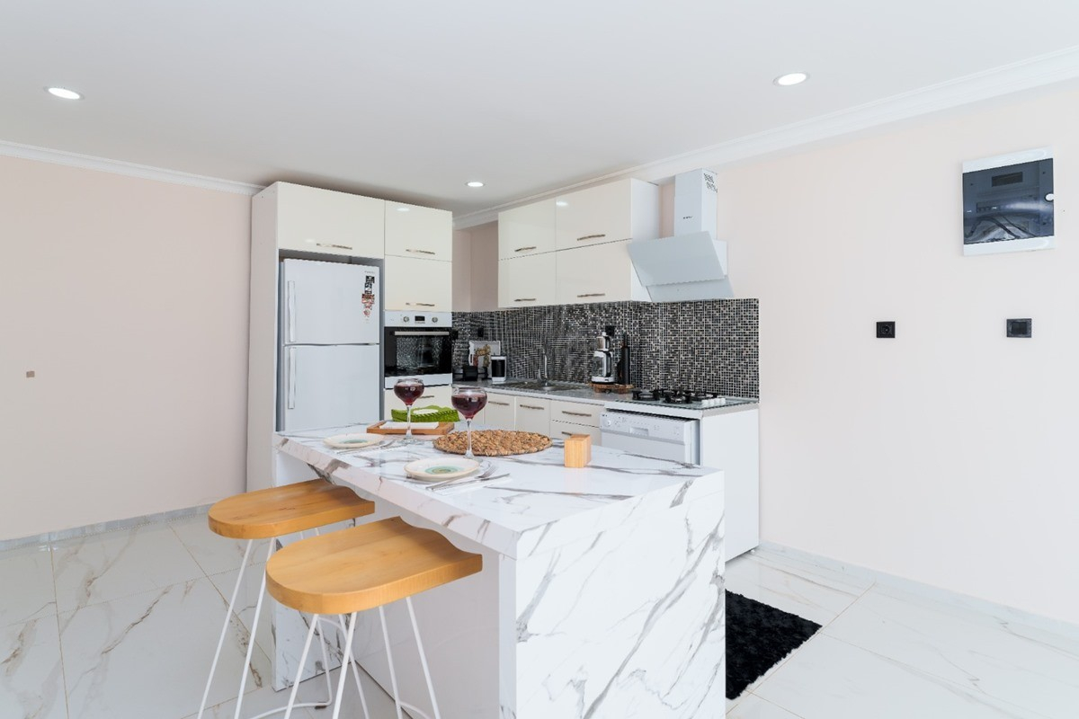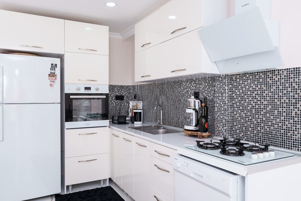 Mutfak : Aydınlık ve ferah modern Amerikan mutfak içerisinde buzdolabı, bulaşık makinesi, ocak, fırın, mikrodalga fırın, su ısıtıcısı, yemek masası, yemek takımı ve yemek pişirme araç gereçleri yer almaktadır.